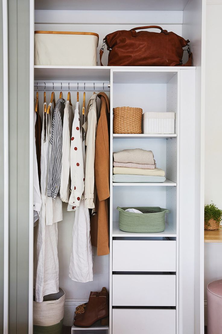Wardrobes are a space in the home that we suggest having either a seasonal or half-yearly clear out to avoid clutter build up. If there are items in your wardrobe that have not seen the light of day in over 12 months, then we suggest either donating or selling them to create more breathing room. We love using matching, felt hangers for all hanging clothes as they allow for a streamlined look and are perfect for space saving. If you fold your clothes, we suggest using the rolling technique and adding drawer dividers to your drawers to keep things neat and tidy. Lastly, any seasonal items such as swimwear or knitwear can be easily stored in baskets at the top of your wardrobe for a functional and space saving hack.